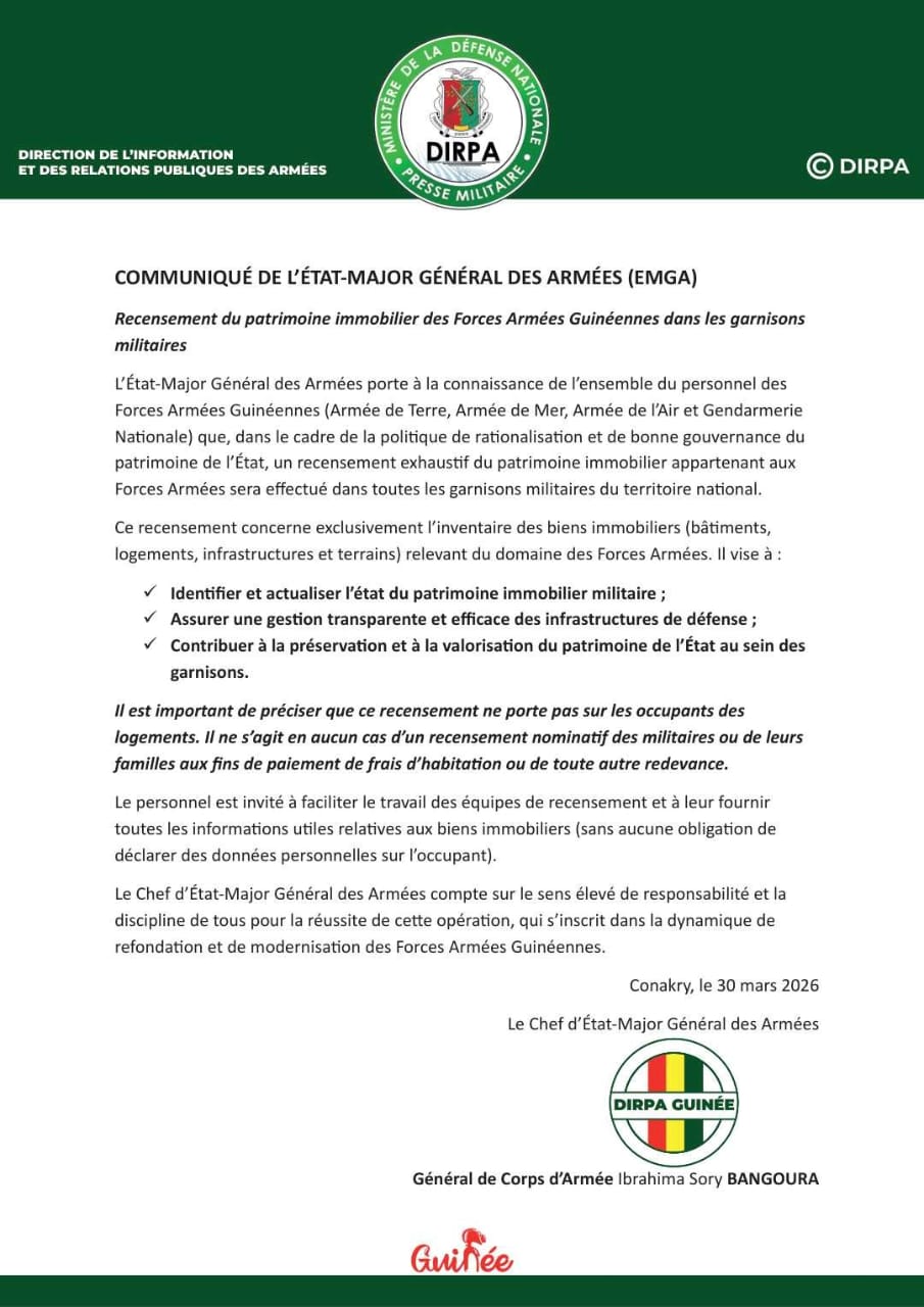 Pour l’instauration d’une meilleure rationalisation et une gouvernance transparente du patrimoine de l’État, l’État-major général des armées, à travers un communiqué publié ce lundi 30 mars 2026, a annoncé le lancement du recensement du patrimoine immobilier des forces armées guinéennes à travers les différentes garnisons du pays.