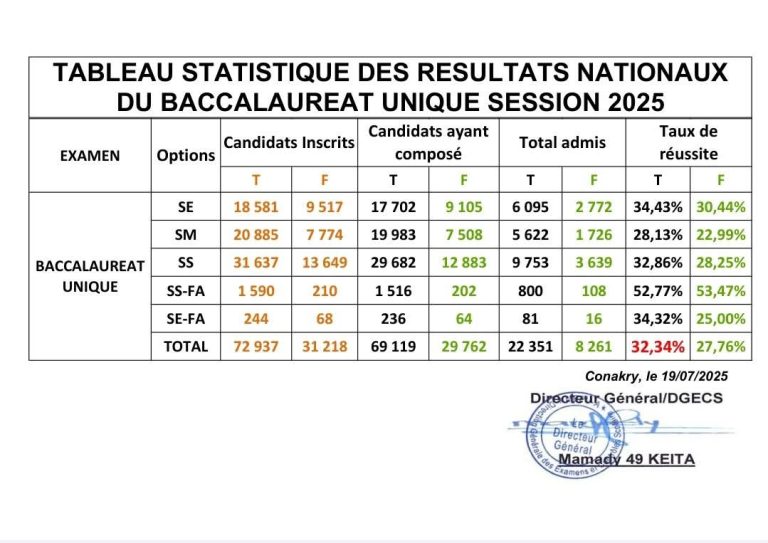 Les résultats du baccalauréat session 2025 viennent de tomber, et ils ne manqueront pas de faire réagir. Selon les données officielles publiées ce samedi 19 juillet par le ministère de l’Enseignement Pré-Universitaire et de l’Alphabétisation, seuls 32,34 % des candidats ont été déclarés admis à cet examen crucial, véritable passerelle vers les établissements d’enseignement supérieur