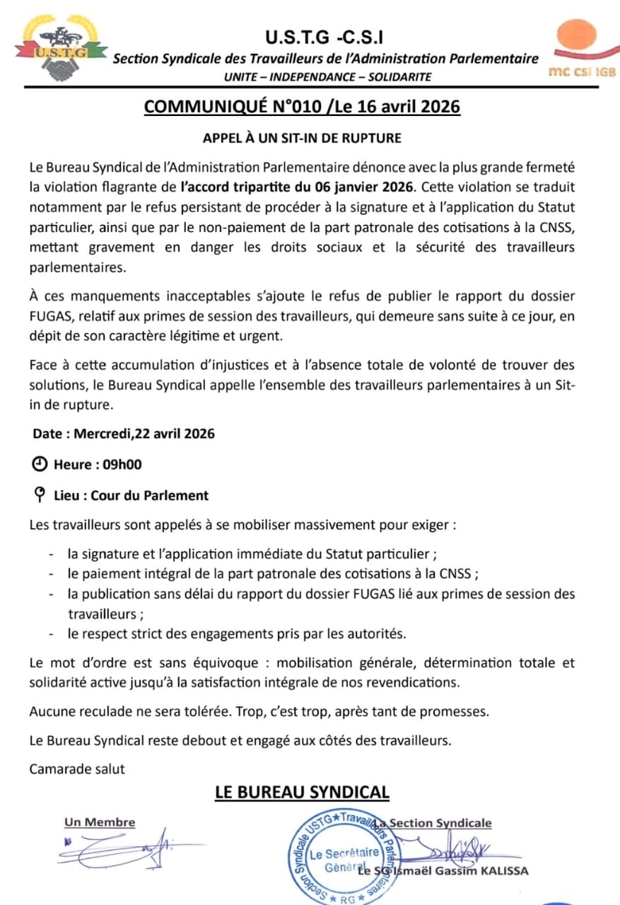 À travers un communiqué rendu public ce mardi 21 Avril 2026, Le Bureau Syndical de l’Administration Parlementaire dénonce avec la plus grande fermeté la violation flagrante de l’accord tripartite du 06 janvier 2026. Cette violation se traduit notamment par le refus persistant de procéder à la signature et à l’application du Statut particulier, ainsi que par le non-paiement de la part patronale des cotisations à la CNSS, mettant gravement en danger les droits sociaux et la sécurité des travailleurs parlementaires.