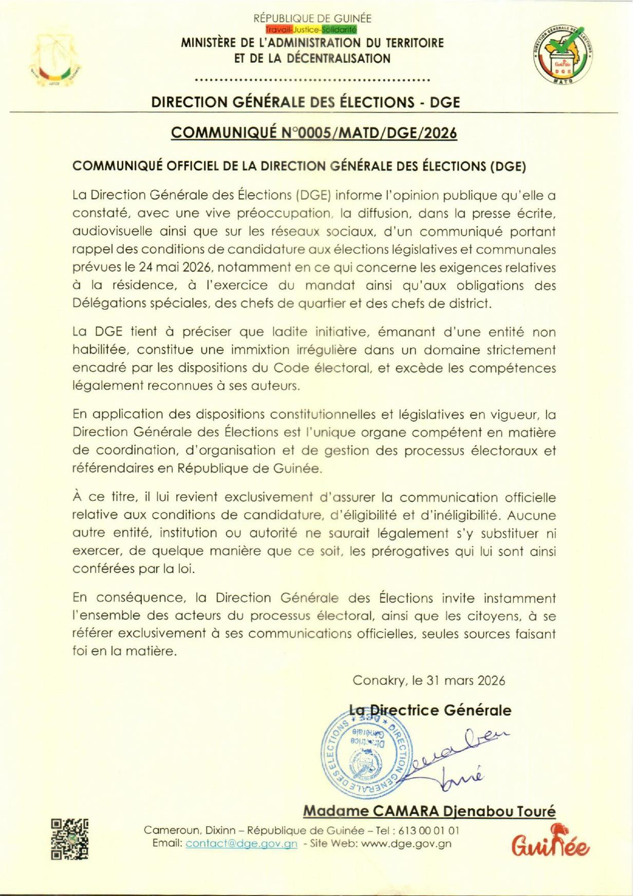 Selon Madame Camara Djenabou Touré, la DGE est le seul organe habilité à assurer « la communication officielle aux conditions de candidature, d’éligibilité et d’inéligibilité. Aucune entité, institution ni autorité ne saurait légalement s’y substituer, ni exercer de quelque manière que ce soit, les prérogatives qui lui sont ainsi conférées par la loi. »