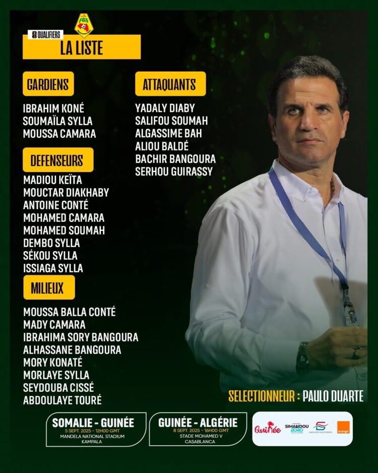 Ce vendredi, le sélectionneur du Syli national, Paulo Duarte, était face à la presse pour dévoiler la liste des joueurs convoqués en vue des deux prochaines rencontres des éliminatoires de la Coupe du Monde 2026. Le Syli A affrontera la Somalie le 5 septembre, dans le cadre de la 7e journée, avant de croiser le fer avec l’Algérie le 8 septembre, une affiche qui se jouera au Maroc.