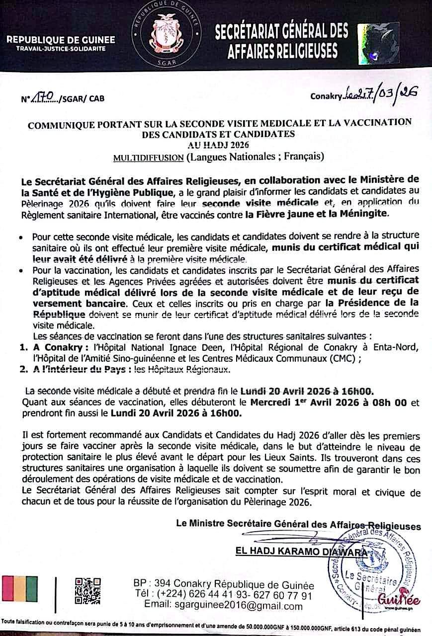 À travers un communiqué dont la copie est parvenue à la rédaction d’Actuguinee.net ce vendredi, le secrétariat général des affaires religieuses en collaboration avec le ministère de la santé, informe les candidats et candidates au pèlerinage 2026 qu’ils doivent passer une seconde visite médicale et, en application du règlement sanitaire international, être vaccinés contre la Fièvre jaune et la Méningite.