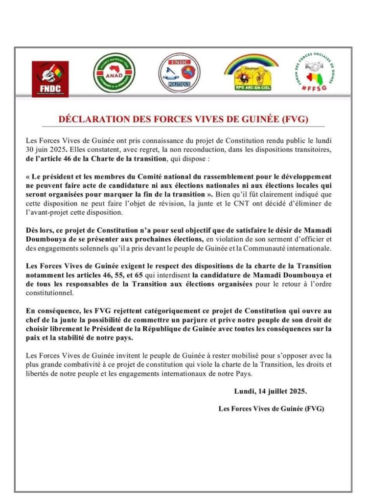 Dans une déclaration rendue publique ce lundi, les Forces Vives de la Nation ont exprimé leurs vives préoccupations concernant le projet de nouvelle Constitution. Elles regrettent notamment l’absence de reconduction de l’article 46 de la Charte de la transition, un verrou juridique essentiel qui interdisait aux membres du CNRD (Comité National du Rassemblement pour le Développement), du CNT (Conseil National de la Transition) ainsi qu’aux membres du gouvernement, de se porter candidats à la prochaine élection présidentielle.