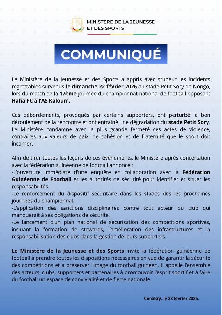 À travers un communiqué dont la copie est parvenue à notre rédaction ce lundi 23 février 2026, le Ministère de la Jeunesse et des sport sous la commande de M. Cellou Baldé , condamne les incidents survenus lors d’une rencontre tendue entre le Hafia FC à l’As kaloum au stade petit sory de Nongo dans le cadre de la 17e journée de ligue 1 Guicopres. Cette rencontre s’est soldée sur le score de 2 buts à 0 en faveur des verts de Hafia FC. Une défaite amère qui a déplu les supporters . Le ministre Cellou Baldé annonce alors, l’ouverture immédiate d’une enquête sur cette rencontre.