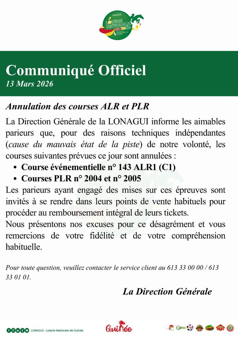 La Direction Générale de la LONAGUI a annoncé, à travers un communiqué officiel publié le 13 mars 2026, l’annulation de certaines courses programmées ce jour. Selon l’institution, cette décision est liée à des raisons techniques indépendantes de sa volonté, notamment le mauvais état de la piste.