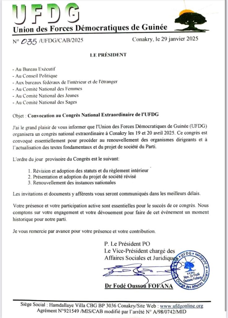 Dernière minute : l’Union des Forces Démocratiques de Guinée (UFDG) a annoncé la tenue de son congrès extraordinaire en avril 2025. Cet événement crucial sera l’occasion de renouveler les instances dirigeantes du parti et d’actualiser ses textes fondamentaux ainsi que son projet de société.