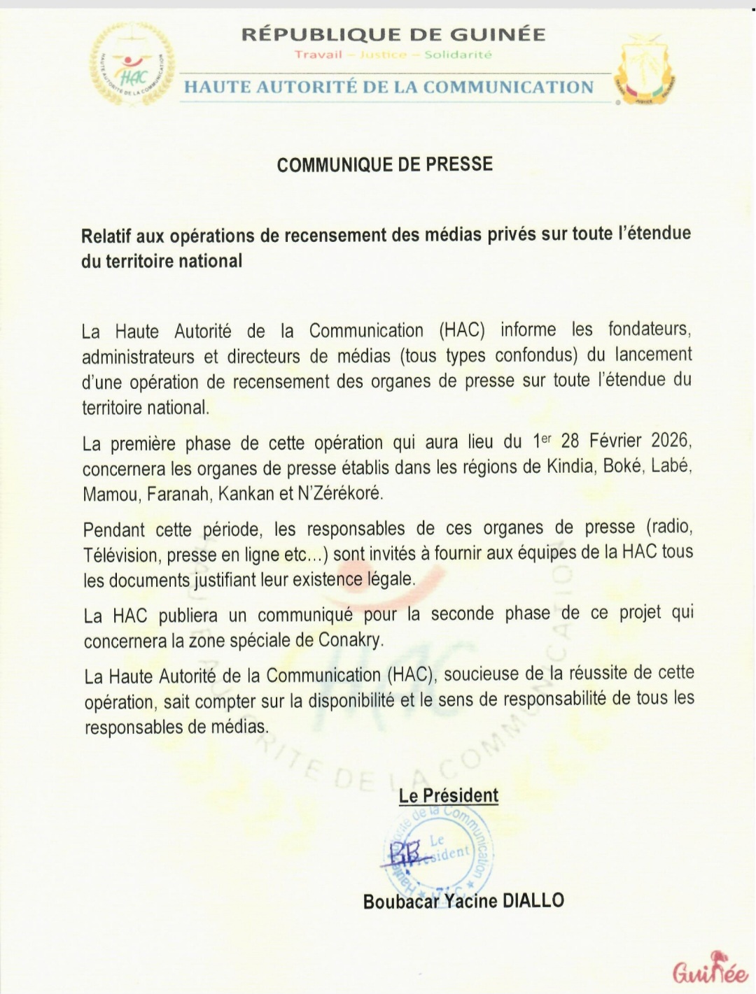 À travers un communiqué dont la copie est parvenue à la rédaction d’Actuguinee.net, la Haute Autorité de la Communication (HAC), a annoncé ce mercredi 28 janvier 2026, une vaste opération de recensement des Médias privés sur toute l’étendue du territoire national.