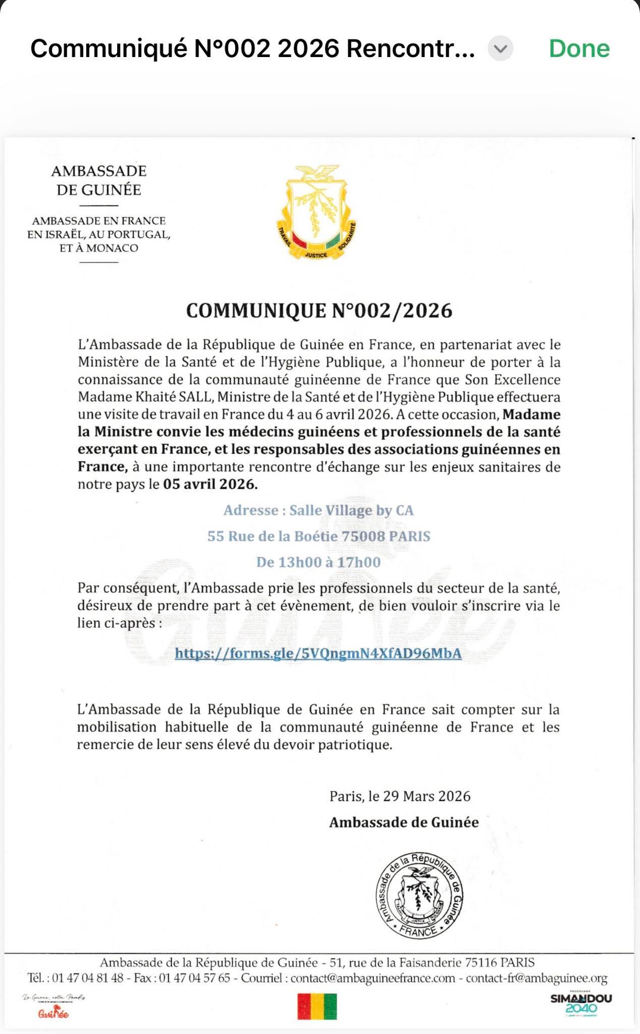 À travers un communiqué rendu public ce Dimanche 29 mars 2026, L’Ambassade de la République de Guinée en France, en partenariat avec le Ministère de la Santé et de l’Hygiène Publique, a l’honneur de porter à la