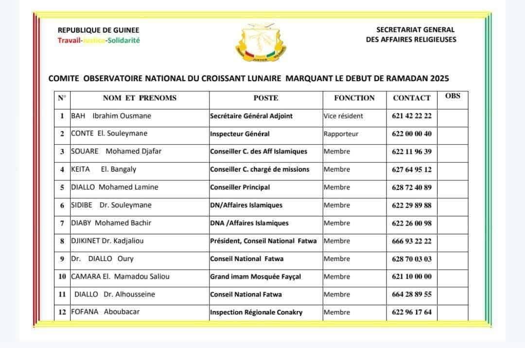 Le ministre et secrétaire général des Affaires religieuses, Karamo Diawara, lance un appel aux musulmans du pays, les invitant à signaler aux autorités religieuses locales toute observation de la lune marquant le début du mois sacré du Ramadan 2025. Il souligne l’importance de cette démarche afin d’assurer le respect des traditions religieuses et de la précision du calendrier. Ci-dessous, vous trouverez la liste des chefs religieux à contacter pour toute information relative à cette observation.