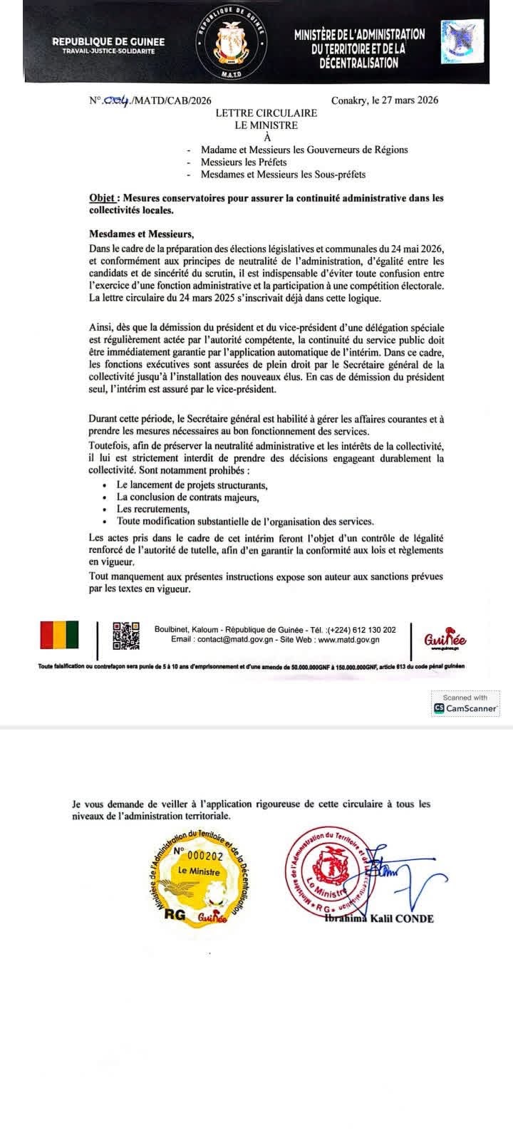 Suite à la démission des présidents des délégations spéciales et de leurs adjoints dans les différentes communes urbaines de la Guinée , le ministère de l’Administration du Territoire et de la Décentralisation (MATD), à travers une note circulaire publié ce vendredi 27 mars 2026, a instruit les secrétaires généraux des communes d’assurer désormais la continuité du service public jusqu’à nouvel ordre.