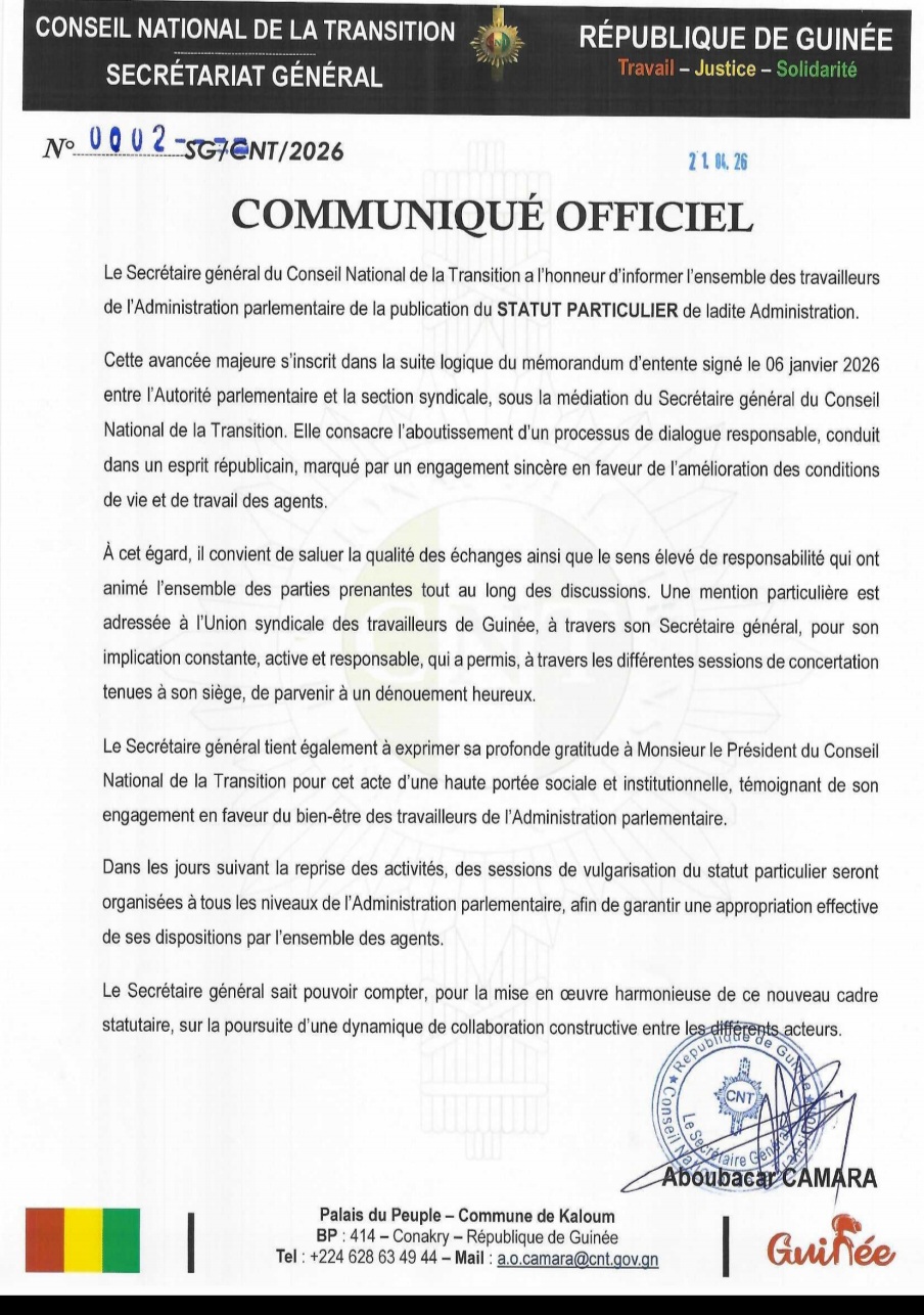 Selon ce communiqué rendu public ce mercredi 22 Avril 2026, cette avancée majeure s’inscrit dans la suite logique du mémorandum d’entente signé le 06 janvier dernier entre l’autorité parlementaire et la section syndicale, sous la médiation du secrétaire général du conseil national de la transition.