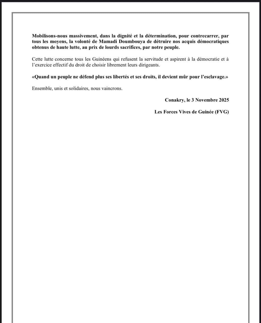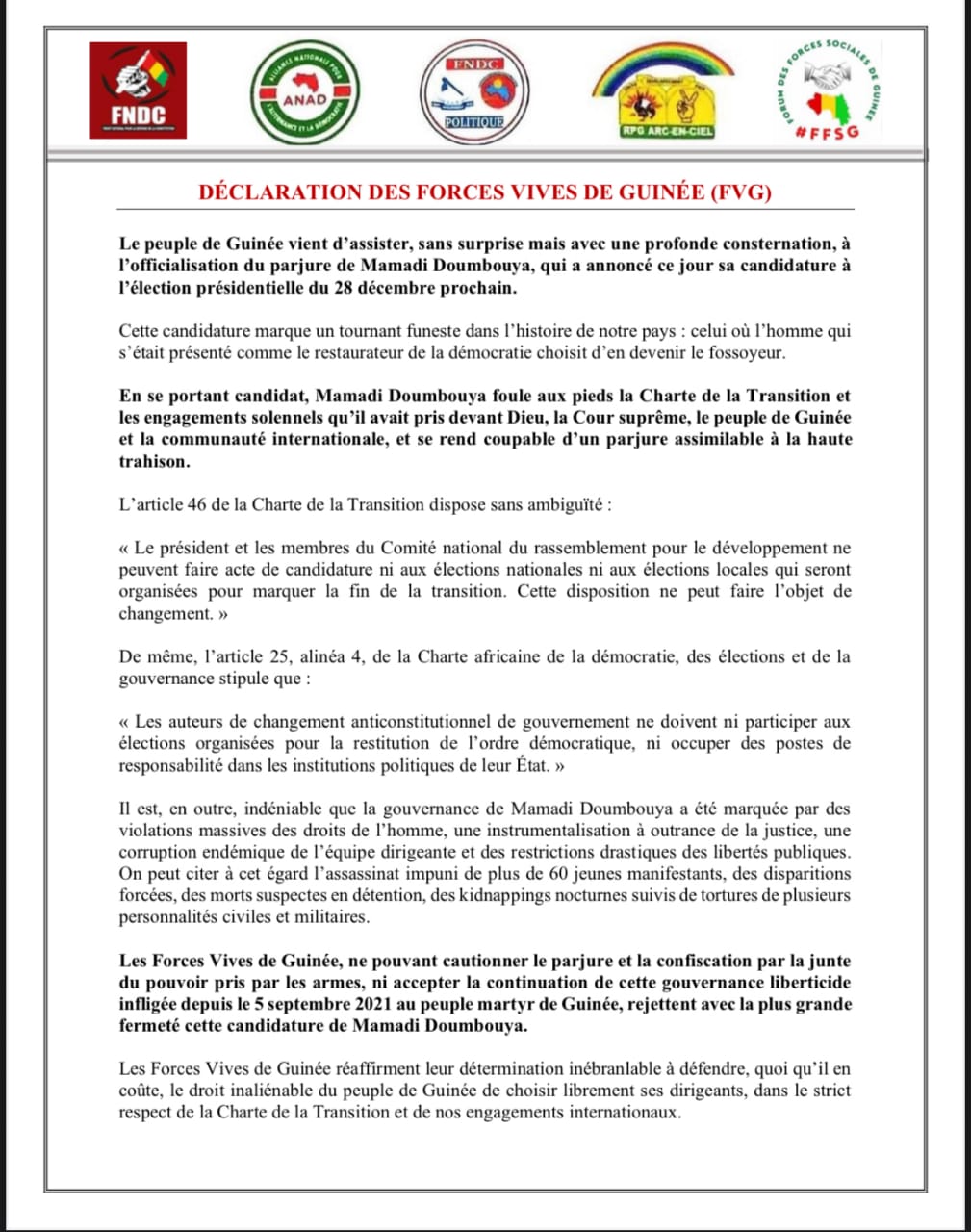 Peu après son départ de la Cour suprême, les Forces Vives de Guinée (FVG) ont publié une déclaration en réaction à cette démarche. Une copie du communiqué a été transmise à actuguinee.net marquant la première prise de position officielle de cette coalition sur la candidature du chef de l’État.