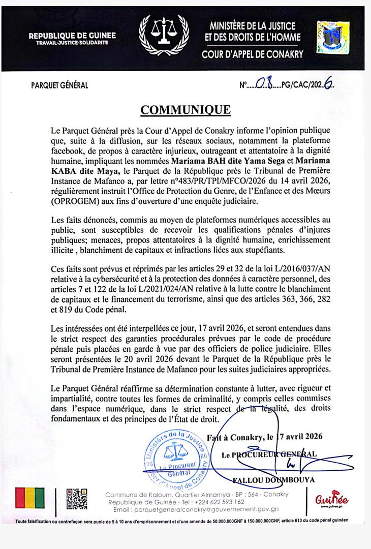 Le Parquet Général près la Cour d’Appel de Conakry informe l’opinion publique que, suite à la diffusion, sur les réseaux sociaux, notamment la plateforme facebook, de propos à caractère injurieux, outrageant et attentatoire à la dignité humaine, impliquant les nommées Mariama BAH dite Yama Sega et Mariama KABA dite Maya, le Parquet de la République près le Tribunal de Première Instance de Mafanco a, par lettre n°483/PR/TPI/MFCO/2026 du 14 avril 2026, régulièrement instruit l’Office de Protection du Genre, de l’Enfance et des Mœurs (OPROGEM) aux fins d’ouverture d’une enquête judiciaire.